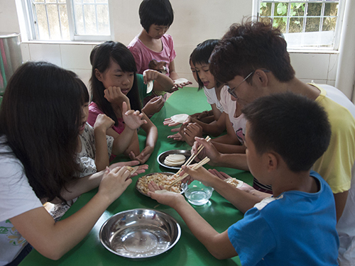 本网讯 8月4日,是太阳成集团思科太阳成集团tyc122cc“五彩星”服务队在钱岗八一小学的第九天,一直照顾队员起居的生活组组织了一场“全民包饺子”的活动,许多小朋友们都体验到了第一次包饺子的乐趣。