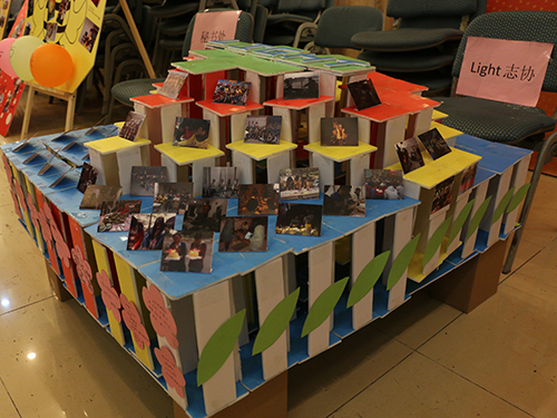 在各部门的照片墙方面,Light志协颇有创意地做了一个立体模型,最顶部是显眼的部门标志,层次分明的照片摆设在逐渐上升的模型周边,最下端还写满了干事们对部门的心声,整体就像层层叠加的爱心,也表达了Light志协“点燃自己,照亮他人”的宗旨。外联部用五颜六色的纸张卷成大树和花朵,画面感十足,寓意颇深——在他们的心里,部门就像是一棵大树,可以为他们遮风挡雨。