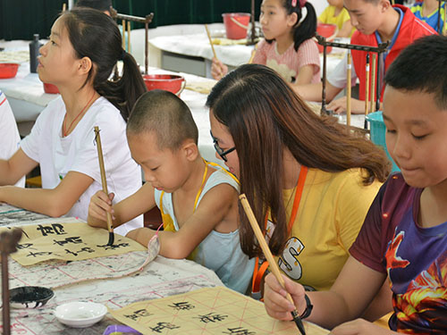 紧接着出发的是义教组。在罗灿明副主任的引领下,义教组组员们作为助教,与相应课程的主教老师对接,各自到达了自己的工作岗位。在自我介绍后,义教组组员们协助主教老师顺利地开展各项课程:篮球课程、足球课程、机器人课程、书法课程、国画课程等等。在书法课上,义教组组员首先和老师了解了员工的基本情况,然后了解了课程的安排和要求。在主教老师的讲解下,脚踏实地、一丝不苟地协助开展了书法课。课程顺利开展,氛围一片融洽。