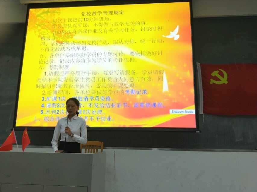 随后,党建组织部部长陈露莹为学员介绍了接下来几天几周内的培训安排。要求学员认真听课,积极发言,及时完成作业。最重要的是要遵守班规,做好考勤记录。还介绍了课程安排,以及为各位学员分组。张文萃老师对纪律问题进行补充,要求各学员严肃认真对待党课培训,做到零请假,零缺勤,零旷课,零补考。